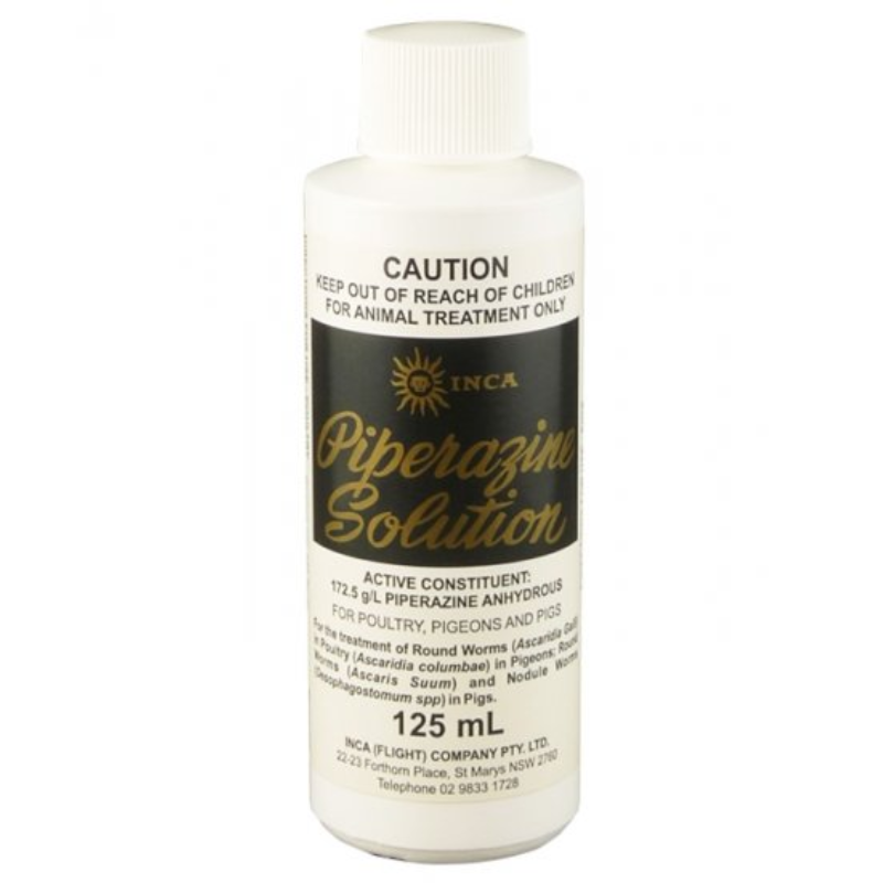 Inca Piperazine Solution Inca Piperazine Solution is an effective wormer for poultry, pigeons and pigs. It protects against Round Worms (Ascaridia Galli) in Poultry, Roundworms (Ascaridia columbae) in Pigeons; and Round Worms (Ascaris suum) and Nodule Worms (Oesophagostomum spp) in Pigs.