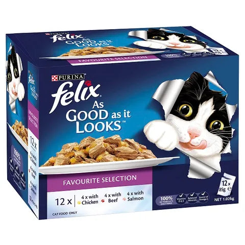 Felix Feline Favourite Selection Felix As Good As It Looks Favourite Selection are delicious meals precisely prepared with tender meaty and fishy pieces in a scrumptious jelly which look and smell enticing. Spoil your cat with this array of highly palatable flavours. This selection contains three different flavours: chicken in jelly, salmon in jelly, and beef in jelly.