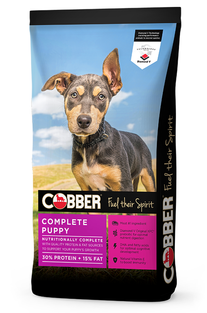 We all want to give them the best start in life, whether they're destined to be your hardest worker or just rounding up the kids. Pups need complete and balanced nutrition to reach their potential. Cobber Complete Puppy, with balanced fat and protein for sustained energy, also contains Diamond V Original XPC prebiotic to accelerate their immune function as they grow. There‚ also DHA for cognitive development to build their sharp minds and lay the foundations for a lifetime of adventures.