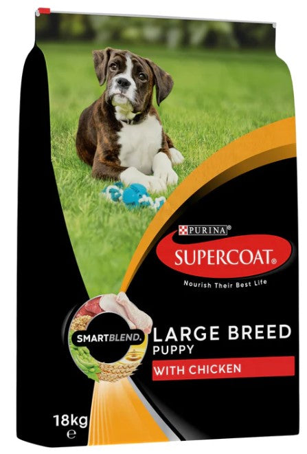 SUPERCOAT Puppy Large Breed Dry Dog Food contains a scientifically balanced protein to fat ratio, ideal for large breeds, glucosamine for healthy joints and mobility, and calcium to help support strong bone development.