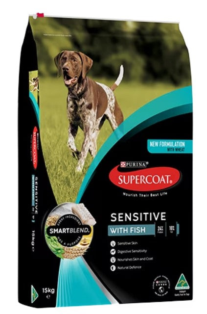 SUPERCOAT SMARTBLEND Adult Sensitive Dog Food With Real Fish has been specially formulated with the goodness of real fish, and omega 3 fatty acids to support the needs of adult dogs with sensitive skin. It also contains a natural prebiotic to help improve digestive health.