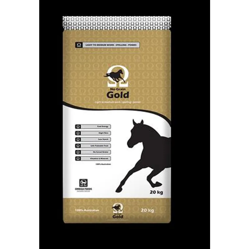 Omega Feeds has formulated a palatable, high fibre, low starch feed that contains a balanced blend of vitamins and minerals to ensure optimum health and vitality. No-Grain Gold is suitable for ponies, spellers and horses in light to medium work. As the name suggests, No-Grain Gold does not contain grain and therefore reduces the risk of digestive upsets, which are often associated with excessive grain intake.