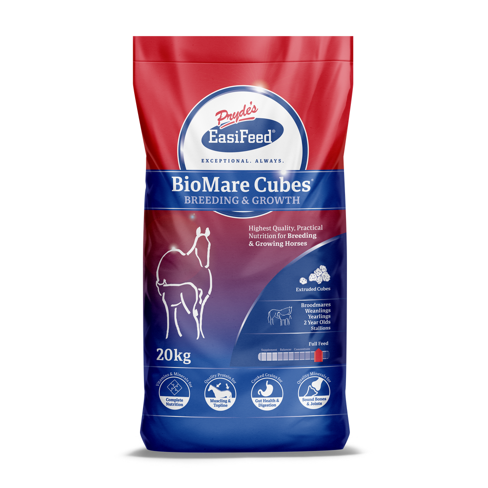 Extruded Corn, Extruded Barley, Extruded Wheat, Extruded Soybean, Extruded Fava Bean, Extruded Lupins, Calcium Phosphate, Salt, Cole Pressed Canola Oil, Dried Molasses, Prydes Trade mineral and vitamin pre-mix, including Bioplex trace minerals for breeding and growing horses, Limestone, Lysine, Vitamin E.