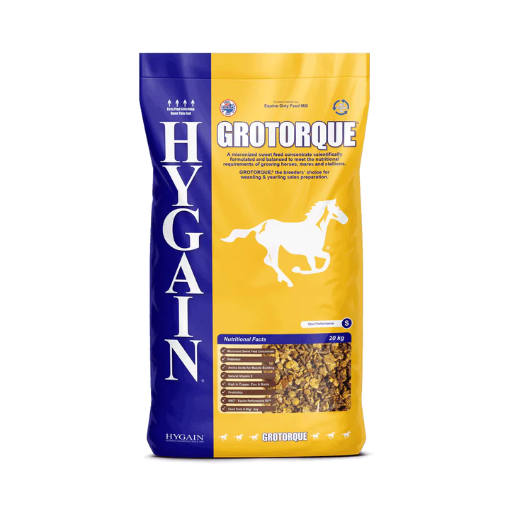 Hygain® Grotorque® is a micronized sweet feed concentrate scientifically formulated and balanced to meet the nutritional requirements of growing horses, mares and stallions.