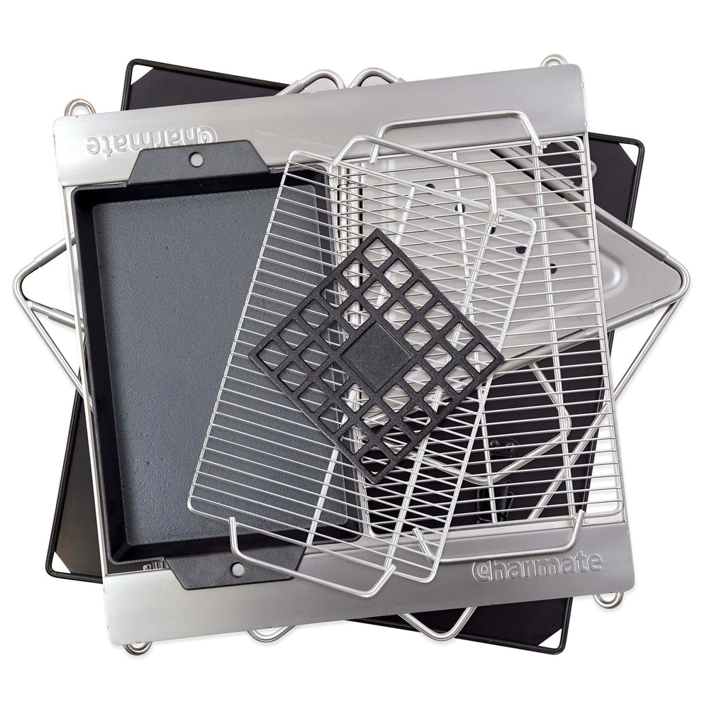 The Charmate Collapsible BBQ & Firepit is versatile - it can be used as a BBQ or firepit with the grill and hotplate inserted and is perfect for camping or your alfresco area. It is constructed from 201 Stainless Steel which is durable, lightweight and long lasting. It also features a powder coated base which will protect your surfaces no matter where you are. It is collapsible - the folding design allows for easy set-up, pack down and space saving storage when not in use, packing into its handy storage bag. Constructed from 304 stainless steel and cast iron, the cooking surface is height adjustable for convenient and versatile cooking.