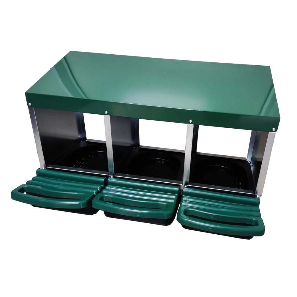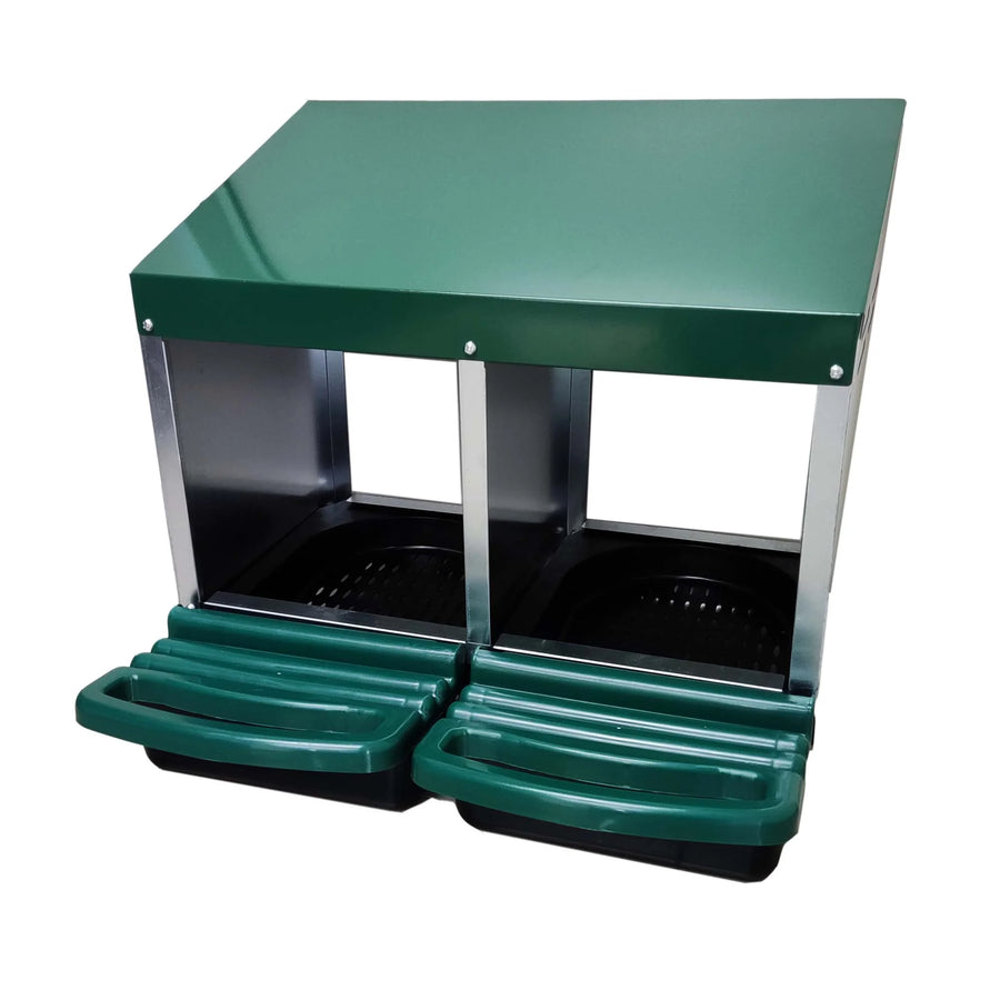 Nesting box with sloped compartment to allow eggs to roll under. Keeps eggs cleaner and away from egg thieves such as crows.