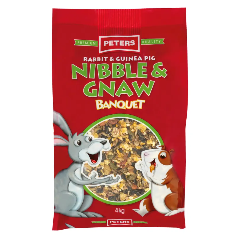 Peters Nibble & Gnaw is a premium blend of crunchy grains, crispy cereal shapes, lupins, beans and maize mingled with sweet tasting carob, banana and carrot.